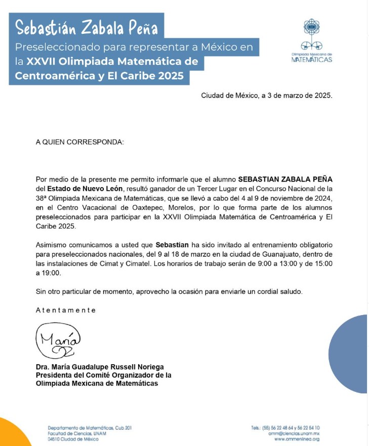 Preseleccionado para representar a México en la XXVII Olimpiada Matemática de Centroamérica y El Caribe 2025.